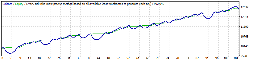 Expected Payoffは24.3で、順利益は2527ドルでした。それは2年間で25,27%利益(年利~11%)という意味です。次に、利益性を高めるために0.5ロットでバックテストをやってみました。リスクも高まりましたが、利益性がかなり上がりました。